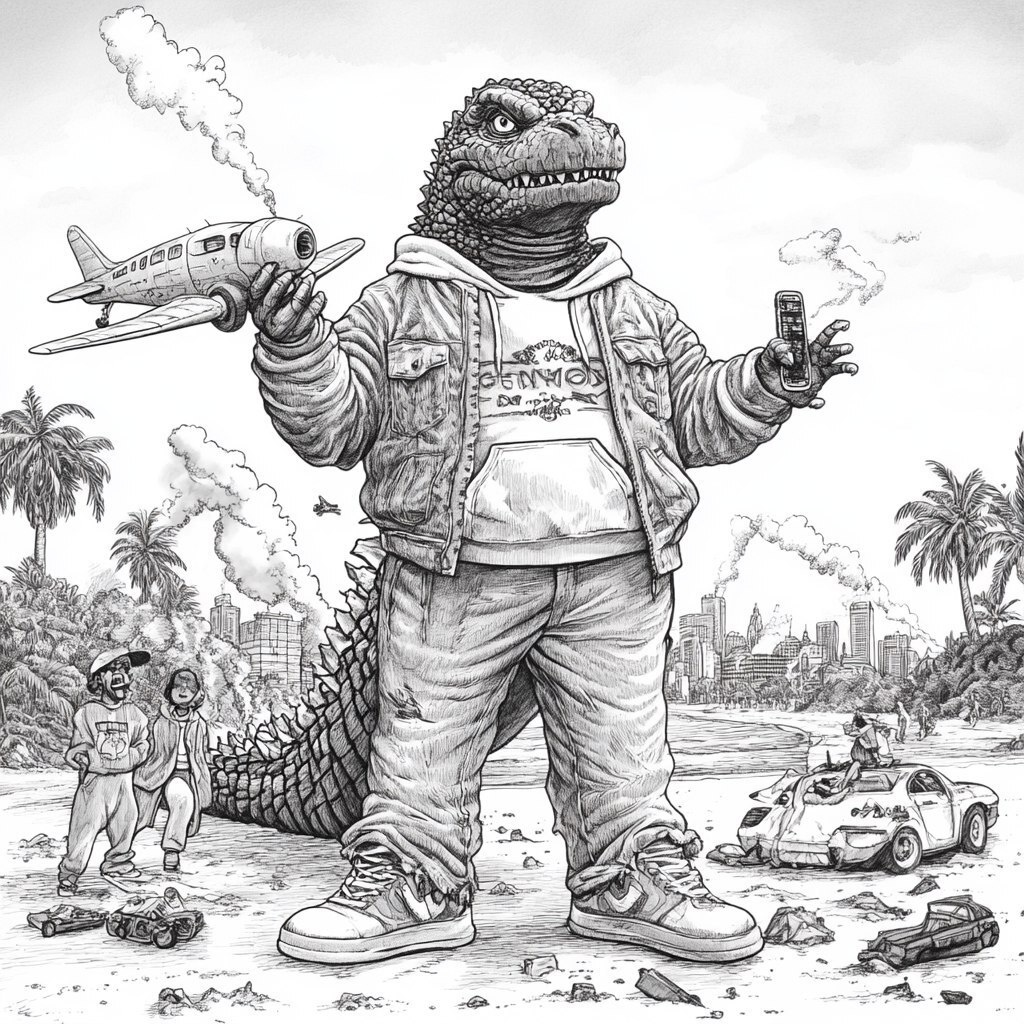 Создано на основе запроса: A black-and-white, hand-drawn cartoon in the style of a New Yorker cartoon. The scene shows Godzilla standing on a beach dressed like a Silicon Valley tech CEO: wearing a hoodie, slim-fit jeans, stylish sneakers, and sleek headphones. He is wreaking havoc in the coastal city and in one hand, it holds a small airplane like a toy; in the other hand, it holds a compact car with casual ease. Behind it, the coastal city appears a chaos, panicked people running, and scattered debris suggest disruption. The overall tone is whimsical, ironic, and slightly absurd. No text or signature should be included.