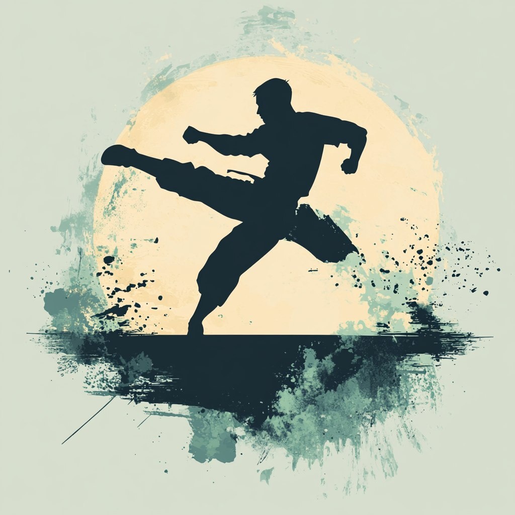 Создано на основе запроса: Martial artist performing a high kick, dramatic pose, clean vector silhouette, 4500x5400px