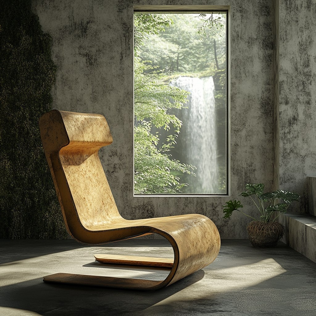 Создано на основе запроса: Poäng Chair pure design, in a brutalist expensive materials built bulding in the Fallingwater style by Frank Lloyd Wright design, next to the chair there is a window looking into the amazonian jungle, waterfall in the background ultra realistic product photography, adobe
