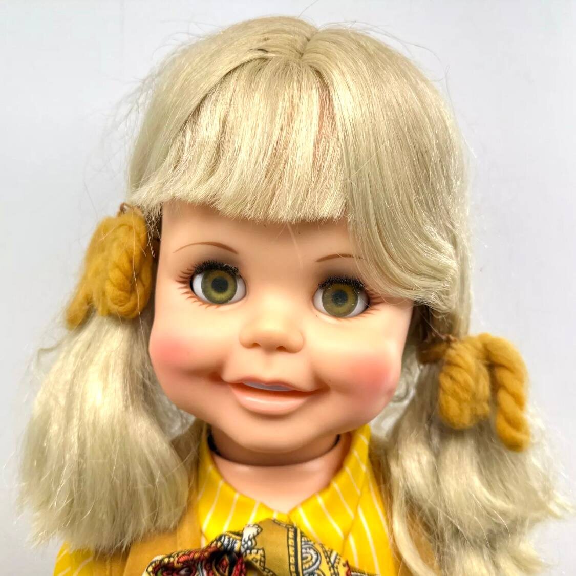 Betty Big Girl - это винтажная кукла от американской компании IDEAL, выпущенная в 1968-1969 годах. Вот её основные характеристики: • Размер: 32 дюйма (около 80 см) • Материалы: виниловая голова, пластиковый корпус. Особенности: ● Функционирующие “ходячие” механизмы ● Голосовой механизм на спине (требуется установка батареек) ● Шарнирное тело ● Мягкая виниловая голова с шарнирным корпусом из твердого пластика. ● Мягкие густые волосы ● Характерная голливудская улыбка ● Чудесные чистые прозрачные глаза необычного цвета Технические возможности: ● Ходит при ведении за руку ● Наклоняет голову из стороны в сторону ● Требует поддержки при стоянии (лучше использовать подставку) У куклы могут быть следы времени в виде небольшого разнотона или светлых пятнышек, что характерно для винтажных игрушек такого возраста. Обычно продается вместе с оригинальной одеждой и аксессуарами (платье, пальто, сумочка, собачка, резиновые туфли). Это довольно редкая и коллекционная модель, особенно в