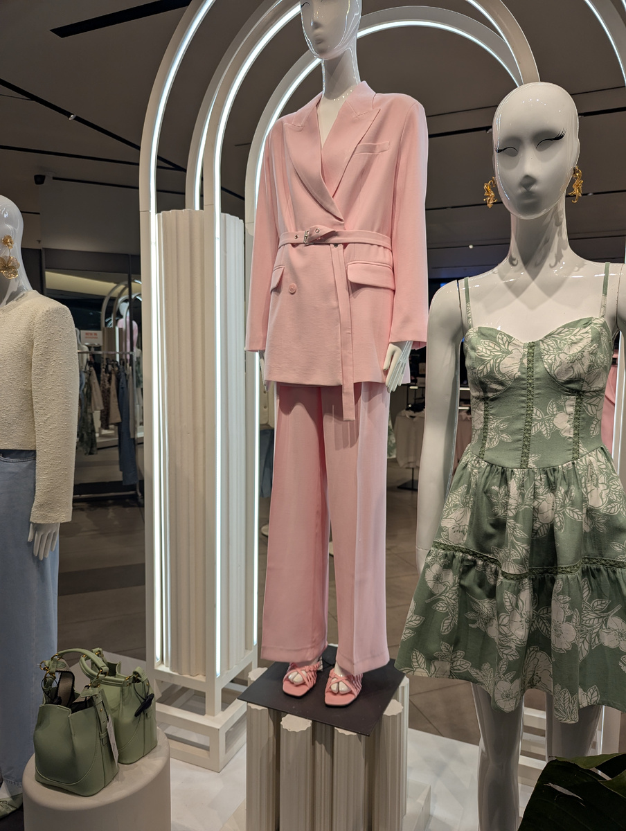Сразу при входе взгляд привлекает вот такой розовый костюм. Цвет - приятный, но в целом, из-за цвета и жакета с мягким поясом, производит впечатление пижамы. Впрочем, это сейчас модно, но не мой стиль, не люблю. Идём дальше.
