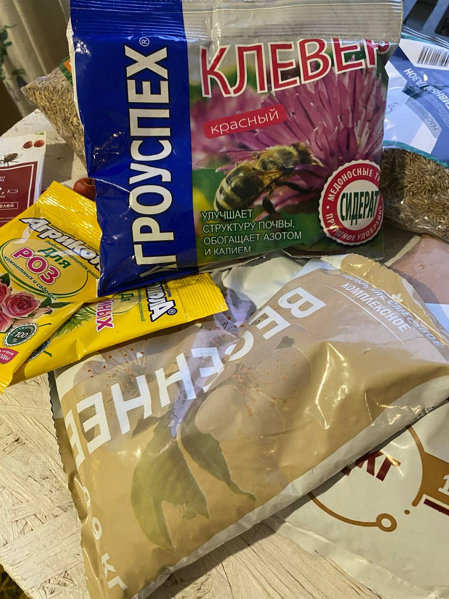 Мы покупали удобрения, газон. Но самая ценная покупка - клевер 🍀. Очень хотим посеять рядом с озером, там где сад хотим разбить.