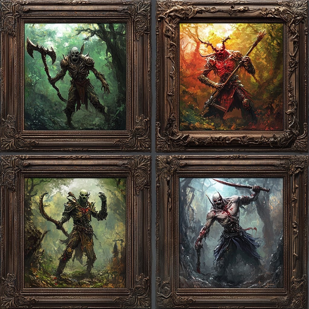 Создано на основе запроса: A set of four trading card frames, each with a unique style: 1. Fantasy-themed frame – A Skelleton Archer. 2. 1. Fantasy-themed frame – A Zombie 3. 1. Fantasy-themed frame – A Lich 4. 1. Fantasy-themed frame – A Dullahan