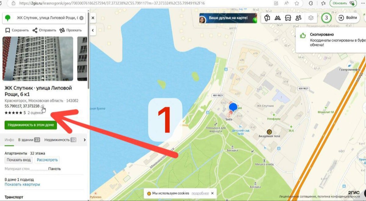 🔎 Шаг 3. Нажимаем на ЖК → копируем координаты.