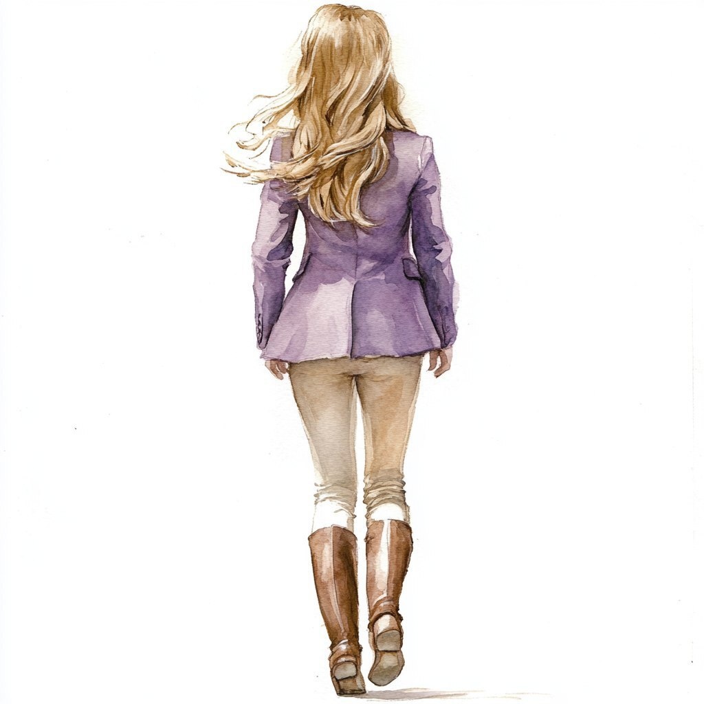 Создано на основе запроса: a watercolour drawing of a young girl with back facing walking away, in a lilac blazer with cream leggings and brown riding boots with blonde hair, white bakcground , high resolution