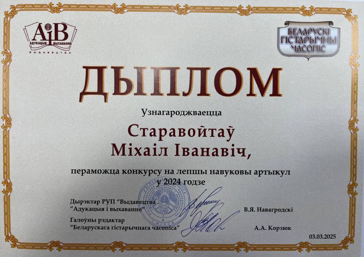 📌Доцент кафедры истории Беларуси Михаил Старовойтов - победитель конкурса на лучшую научную статью 2024 года объявленного редакцией