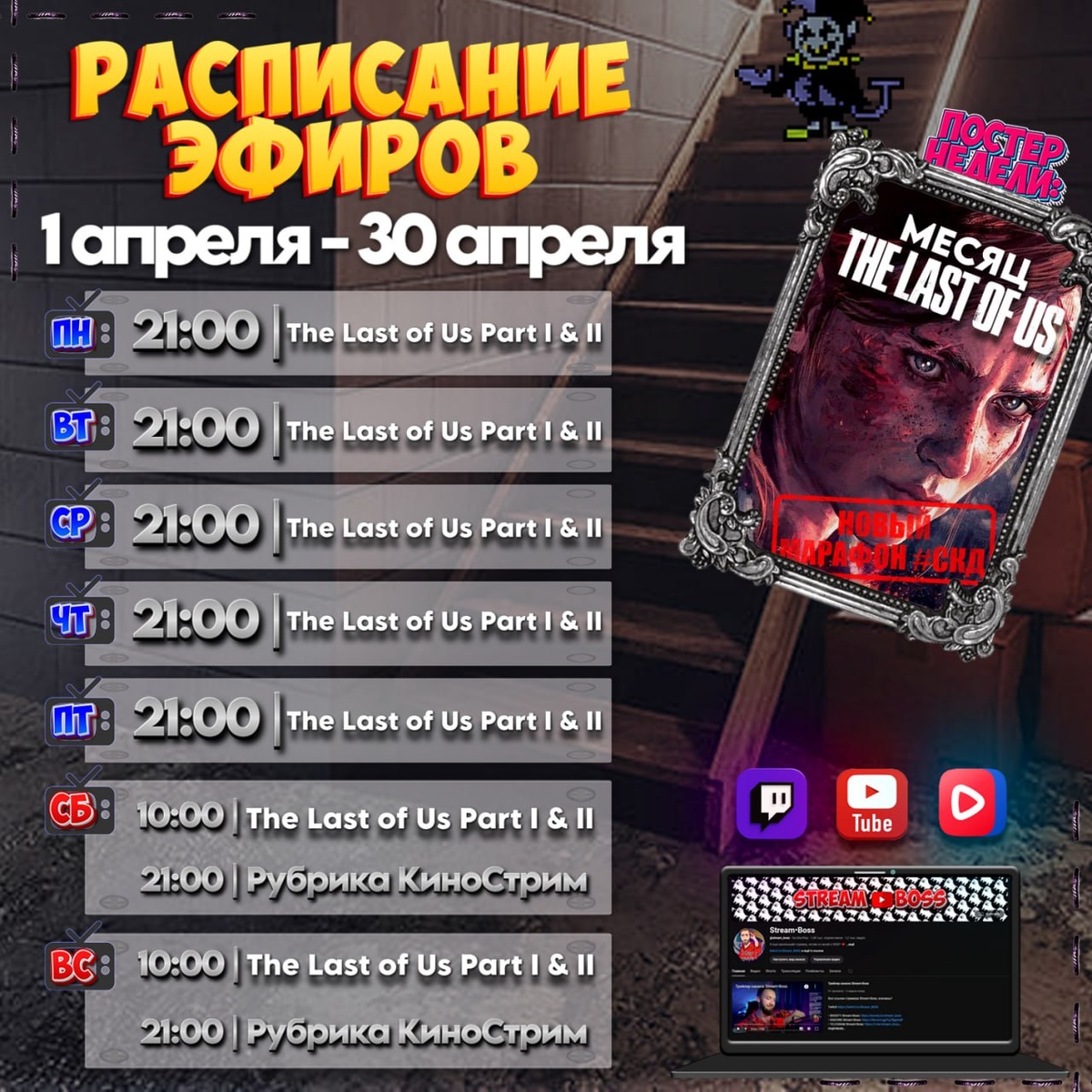 УЧЕНЫЕ ОБЪЯВИЛИ МЕСЯЦ THE LAST OF US Что происходит? Четвертый Марафон! Это новый Марафон #СКД - Стрим Каждый День! Вы скучали? Дааааа! Это свершилось! Почему выбор игры такой? Потому что я отдаю дань уважения, своей любимой игре, которая когда-то познакомила многих крутых пупсов с моим каналом, ну и прежде всего - Нил Дракманн гений. А еще, выходит и игра The Last of Us Part II на ПК - 3 апреля и сериал выходит, поэтому весь мир будет шуметь вокруг этой вселенной, и мы тоже! Так что надеюсь увидеть тебя на стримах и среди фанатов этой прекрасной игры! Удачи всем и приятного марафона нам с тобой :3 *всех цмок* #расписание #стримов #стримбосс #новыймарафонскд #скд #марафонскд #tlou #tlou2 #thelastofus #одниизнас #thelastofuspart2 #thelastofuspart1 #tlou1 #тлоу #последниеизнас Текущий пул игр, на будущее расписание: 🕺 Mass Effect 3 (заказ) 🕺 Hollow Knight (заказ) 🕺 Silent Hill 2 Remake (заказ) 🕺 I wanna kill the Kamilia (заказ) 🕺 I wanna be the Boshy (заказ) 🐽 The Witcher 3 (за