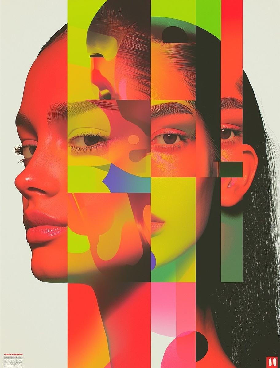 Создано на основе запроса: A neon pink and neon green risograph of the faces of two women, one with long hair in the foreground, is a grid made up of squares that show different faces of women, a simple illustration in the style of vector art, with flat colors.