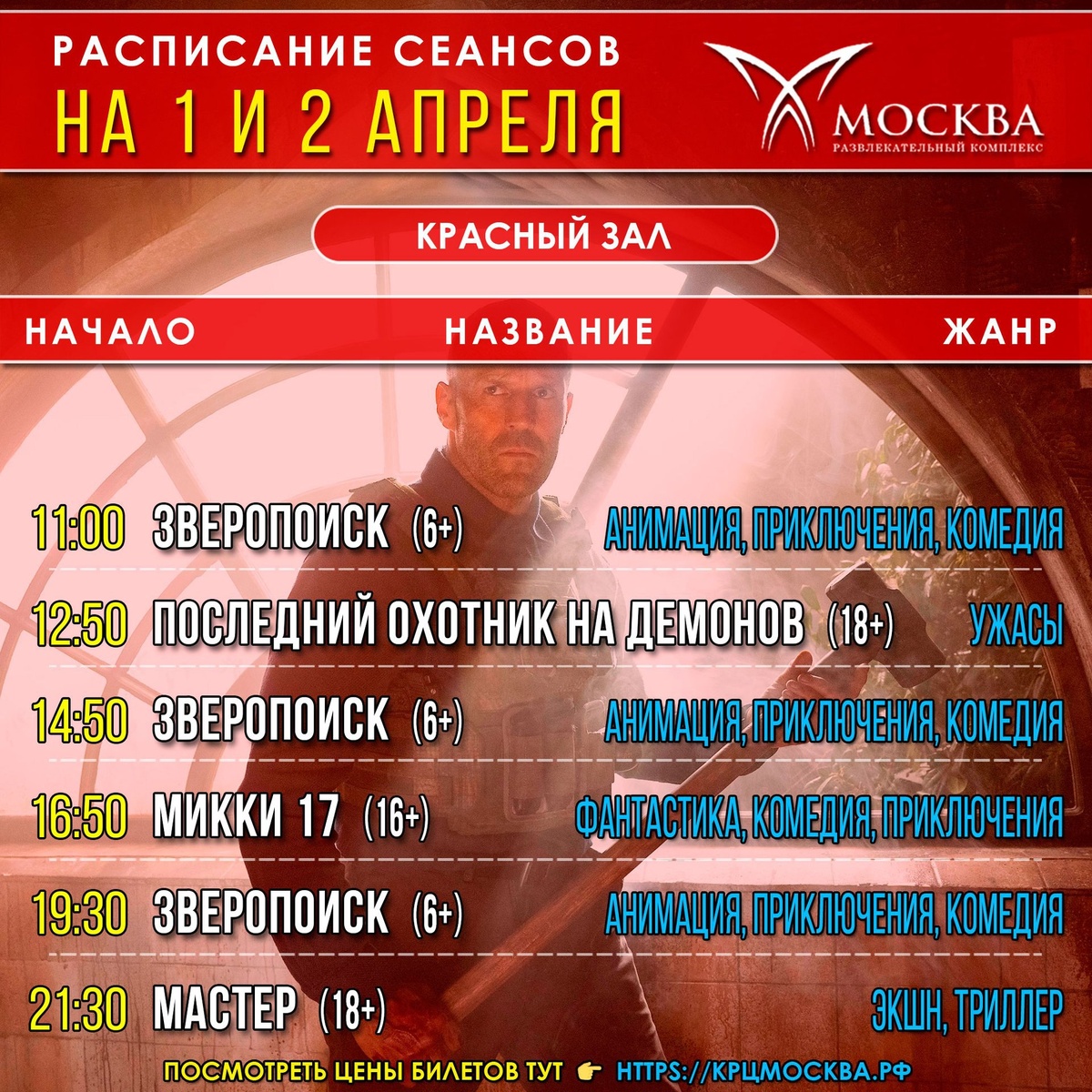 #расписание_сеансов на 1 и 2 апреля Посмотреть цену и купить билеты онлайн можно на нашем сайте https://крцмосква.рф/ и в приложении Google Play и App Store «Кинотеатр Москва, г. Каспийск» ▰▰▰▰▰▰▰▰▰▰▰▰▰▰▰▰▰ #купитьбилет #афиша #смотритевкино #крцмосква #каспийск #ценабилетов #кино #фильм #cinema #kaspiysk