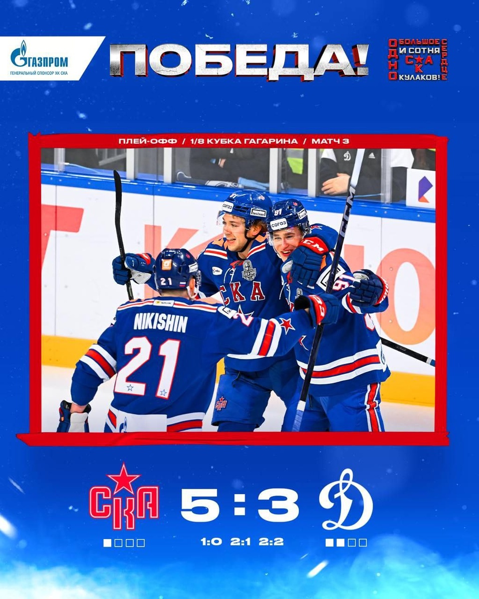 СКА взял третью игру серии! Армейцы победили московское «Динамо», хотя матч был непростым. Начали бодро, но потом гости сравняли 3:3. Вывезли на характере. Вся борьба еще впереди ! Подпишись на Комсомольскую правду: СПб — отдай свой буст нам