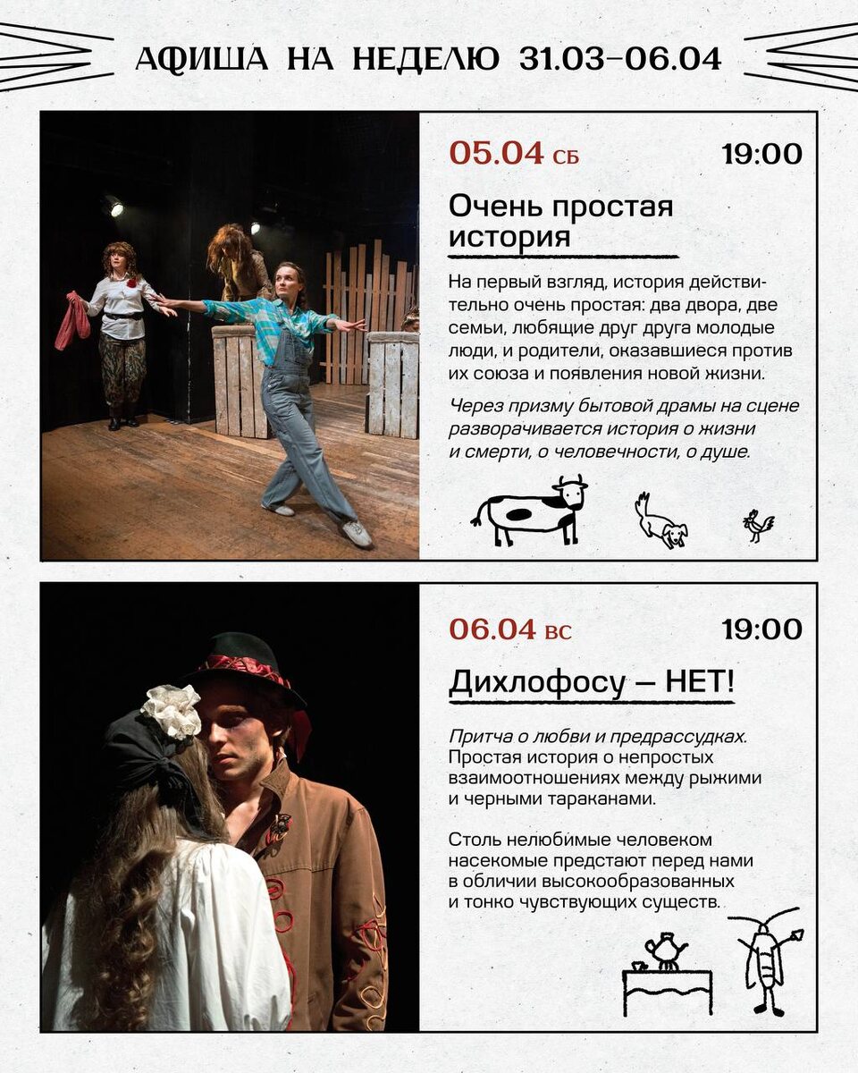 Афиша на неделю🎭 🏚️Суббота, 5 апреля в 19:00 – «Очень простая история» 🪳Воскресенье, 6 апреля в 19:00 – «Дихлофосу – НЕТ!» Бронируйте билеты на сайте театра — art-teatr.ru А также, по телефону: +7 (916) 460-37-62 и +7 (495) 510-56-23 Ждём вас в Новом Арт Театре✨️
