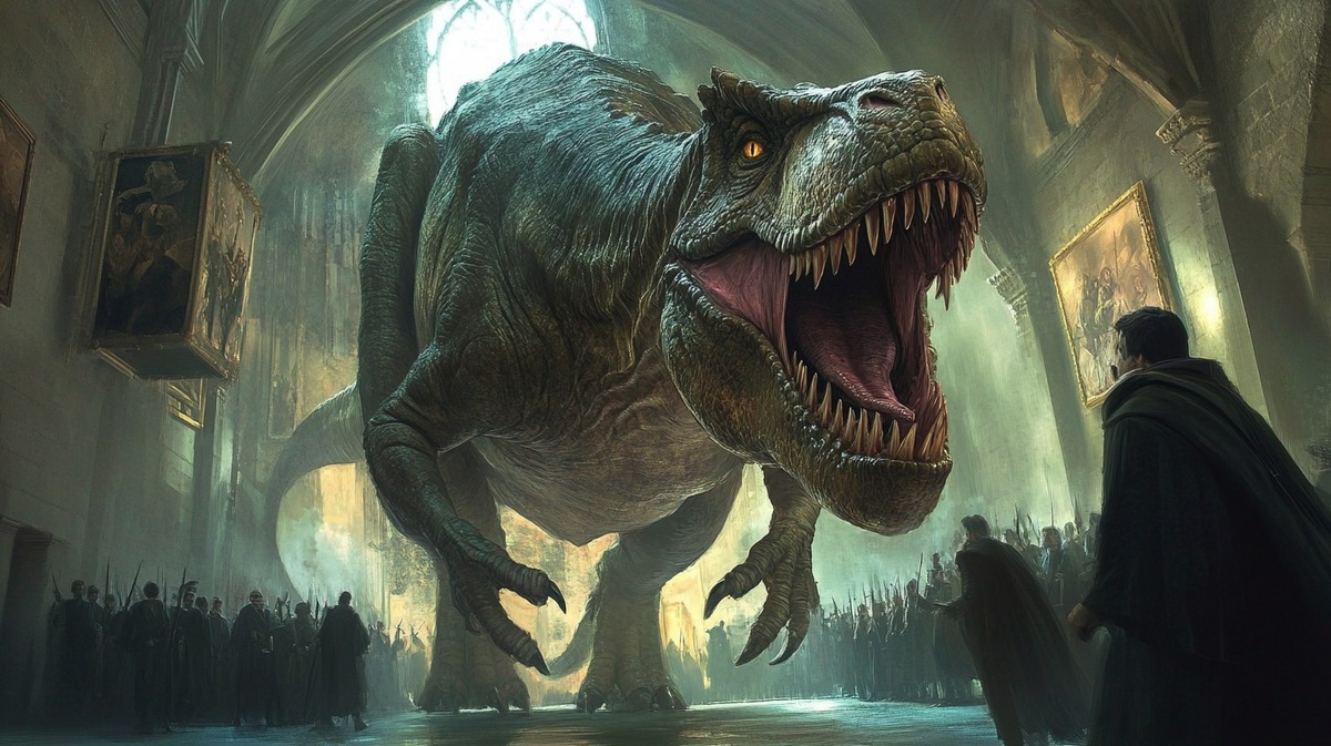 Создано на основе запроса: A T-Rex revealed to be the true hero of The Battle of Hogwarts