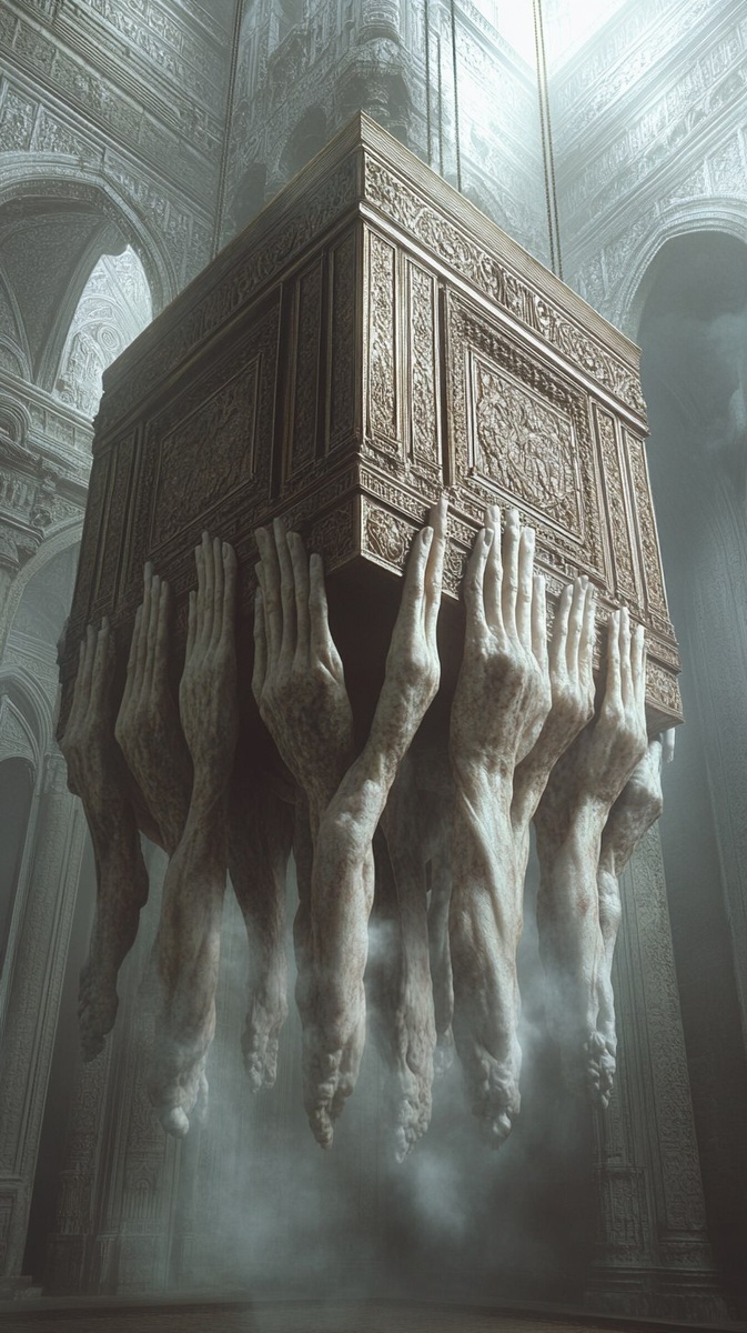 Создано на основе запроса: A massive, intricately carved wooden box is suspended in the air by many hands of different sizes and shapes that