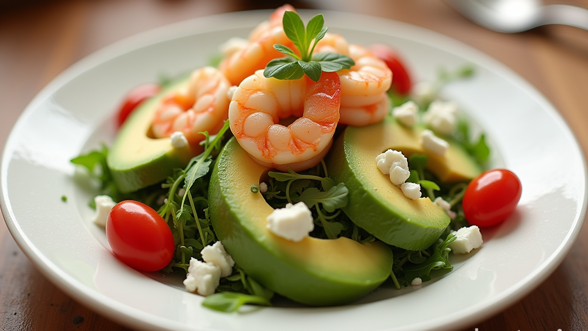 Любой веган будет в гастрономическом восторге. Этот салат выручает всегда, когда нужна свежесть, легкость и красота. А главное из простых и доступных продуктов. Креветки — 200 г (крупные, очищенные) Авокадо — 1 шт. (спелый, нарезанный кубиками) Огурец — 1 шт. (тонкие ломтики или спирали) Томаты черри — 10 шт. (разрезанные пополам) Руккола — 50 г (или смесь салатных листьев) Фета — 70 г (раскрошенная) Кедровые орехи — 2 ст. ложки (обжаренные) Оливковое масло — 3 ст. ложки Лимонный сок — 1 ст. ложка Чеснок — 1 зубчик (мелко рубленный) Мёд — 1 ч. ложка (или кленовый сироп) Соль, перец — по вкусу Мята — 5 листиков (тонко нарезанных) Креветки обжарьте на оливковом масле с щепоткой паприки (1–2 минуты до розового цвета). Соберите салат: На тарелку выложите рукколу. Добавьте авокадо, огурцы, томаты и тёплые креветки. Посыпьте фетой и кедровыми орехами. Заправка: Взбейте все ингредиенты венчиком, полейте салат перед подачей. Украсьте долькой лимона и веточкой укропа. Подавайте с хрустящим баг