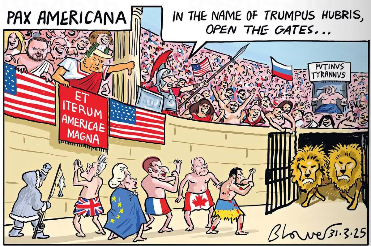 Забавные «гладиаторы» собрались на арене. С лёвами, похоже, собрались сразиться только напомаженный Макрон и покрытый этой помадой с ног до головы Зеленский в потрепанной юбке (даже страшно представить, что Макрон делал с Зе перед выходом на арену). Стармер молит о пощаде императора Трампуса. А вот гренландский рыболов, похоже, будет отвлекать кошечек рыбкой.
