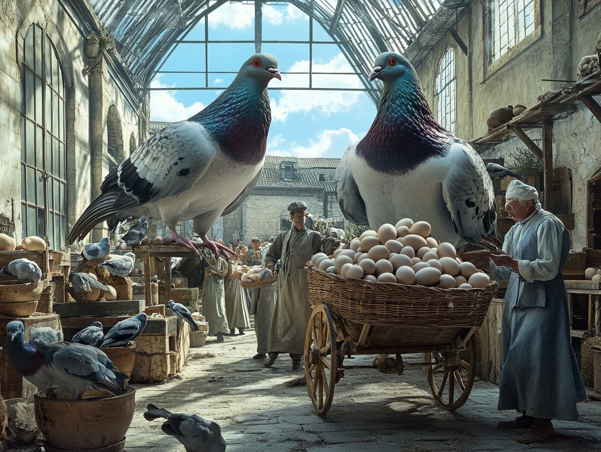 Создано на основе запроса: A brightly lit photograph of 8 foot tall giant pigeons towering over smaller people in a fifteenth century hatchery. The people are well dressed workers carrying ceramic bowls. One worker is carrying a basket of giant eggs. At the back is an opening into the street with a wooden cart filled with eggs. There are large open windows in the hatchery that show blue skies above. Sony A65 camera. --- Автоперевод: Ярко освещенная фотография гигантских голубей высотой 8 футов, возвышающихся над более мелкими людьми в инкубатории пятнадцатого века. Как тебе такая иллюстрация? 🤔 https://dzen.ru/id/65c0c65c86e4f837c27b24d7 #ИИ #AI #нейросеть #midjourney #art