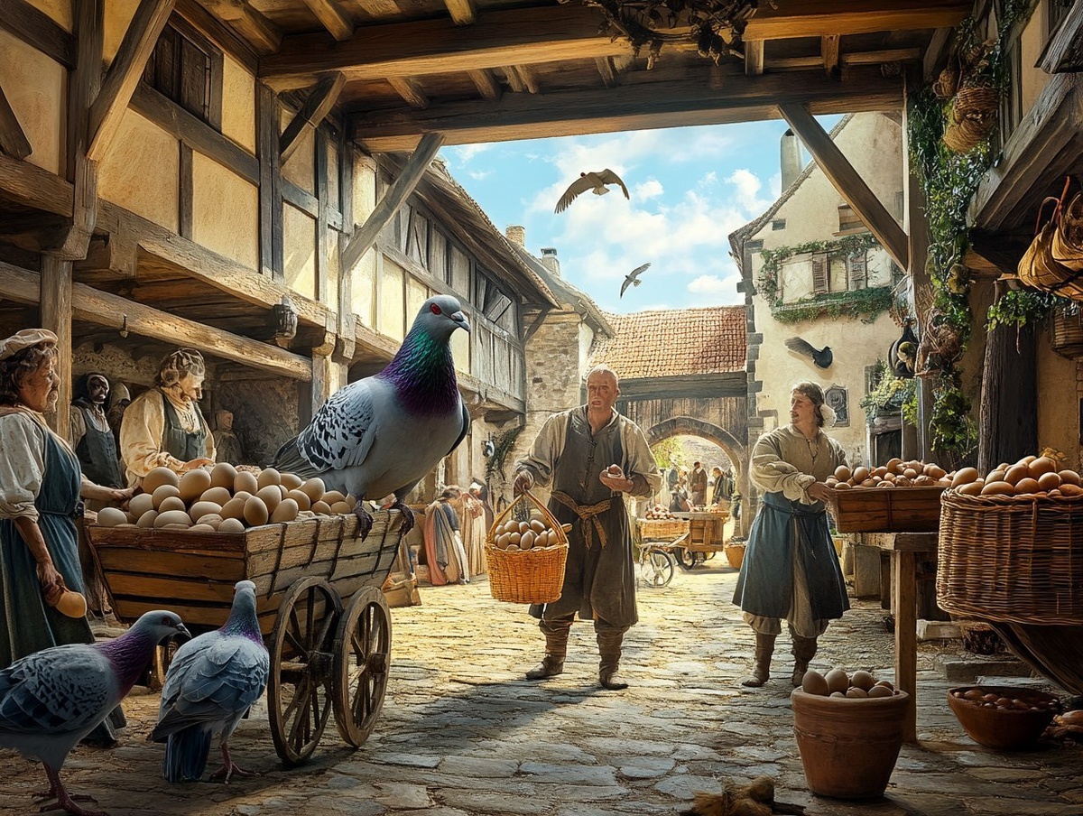 Создано на основе запроса: A brightly lit photograph of 7 foot tall giant pigeons towering over smaller people in a fifteenth century hatchery. The people are well dressed workers carrying ceramic bowls. One worker is carrying a basket of giant eggs. At the back is an opening into the street with a wooden cart filled with eggs. The pigeons are in wooden stalls. There are large open windows in the hatchery that show blue skies above. Sony A65 camera. --- Автоперевод: Ярко освещенная фотография гигантских голубей высотой 7 футов, возвышающихся над более мелкими людьми в инкубатории пятнадцатого века. Отлично выглядит? 🤔 https://dzen.ru/id/65c0c65c86e4f837c27b24d7 #ИИ #AI #нейросеть #midjourney #art
