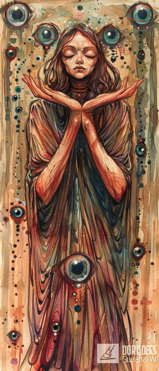 Создано на основе запроса: neon alcohol ink drawing of an ancient Celestial Biblically accurate angel many eyes on her robe, multiple arms holding out hands with eyeballs in them, symmetrical composition detailed illustration in the style of dark fantasy artist and junji ito and Scott M Fischer high contrast, surrealism