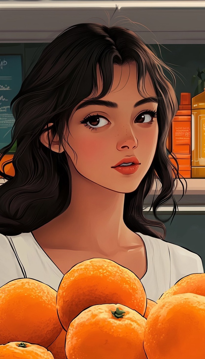 Создано на основе запроса: front extreme close up of orange, a Latin girl with her hair up, staring at the shelf where the oranges are,In