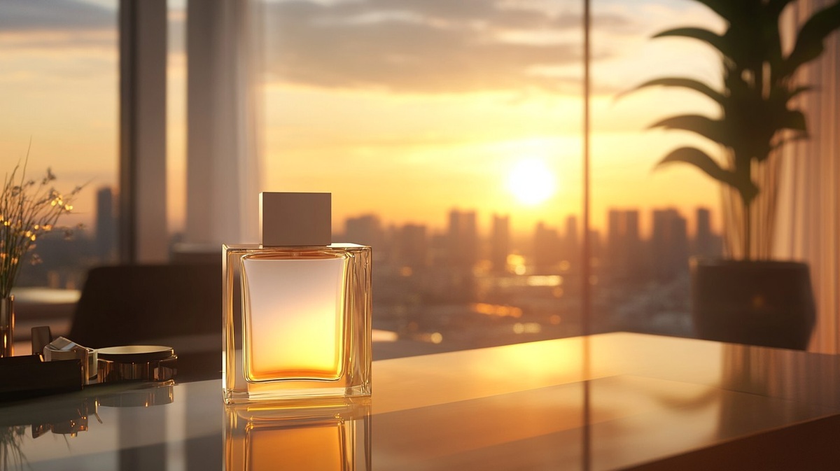 Создано на основе запроса: The white plain perfume bottle glowing under a golden sunset on a chic dressing table inside a modern apartment