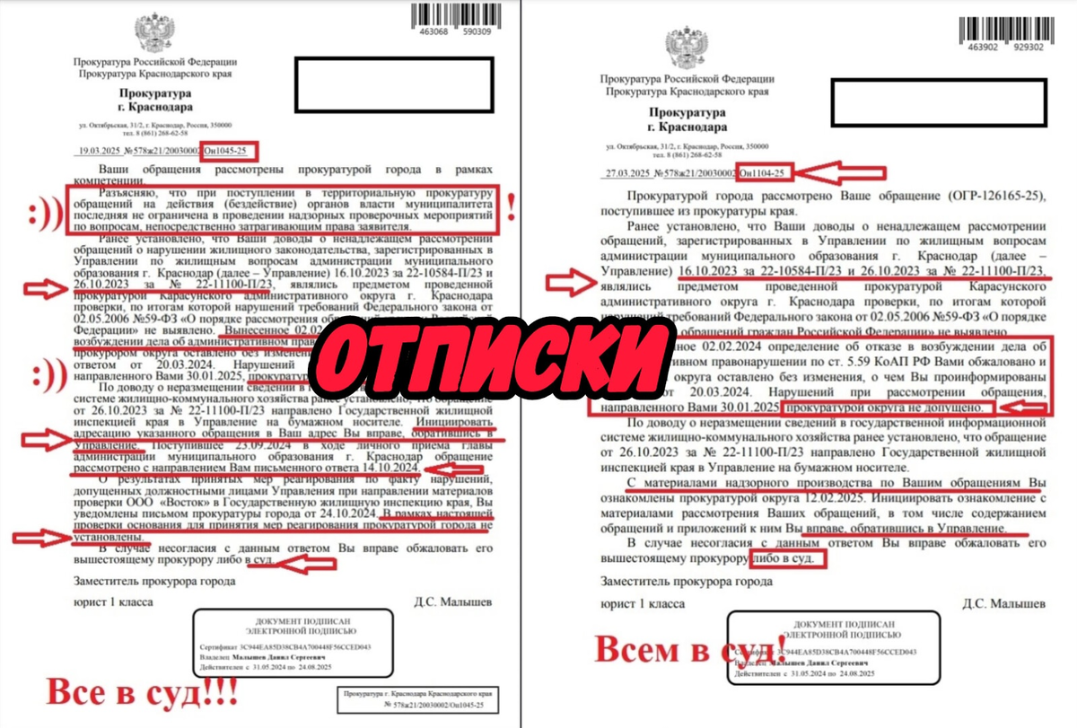 Прошу Вас лично проконтролировать данный вопрос, так как местные надзорные органы на Кубани создали «систему круговой поруки», при которой, прокуратура, на любом уровне покрывает нарушения ГЖИ, УЖВ администрации (администрации), а жалобы граждан перенаправляются тем, на кого пожаловался гражданин, при чём, пожаловался ни один раз!
