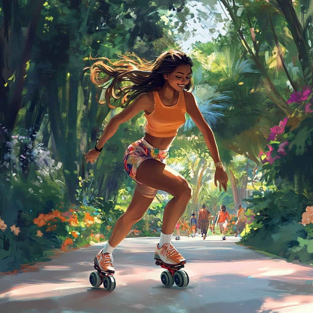 Создано на основе запроса: An Indian adolescent girl wearing a sporty outfit, skating on rollerblades through a vibrant park. She moves with confidence and energy, her hair flowing behind her as she glides along the smooth path. The park is full of greenery, with tall trees, blooming flowers, and people enjoying the sunny day in the background. The light filters through the leaves, casting playful shadows on the ground, creating a lively, active atmosphere. --- Автоперевод: Индийская девушка -подростка, одетая в спортивный наряд, катается на катаниях на роликах через яркий парк. Неплохо выглядит? 🤔 https://dzen.ru/id/65c0c65c86e4f837c27b24d7 #ИИ #AI #нейросеть #midjourney #art