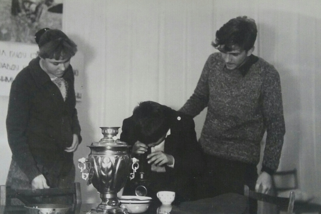 На сцене актового зала "Школы 2" в Севастополе спектакль, 90-й год, предпоследний или последний в 10-летнем обучении, класс 9-10 (10-11) В, брат стоит, его одноклассницу не узнаю, а склонился над микроскопом видимо, Джон (Женя) Шевченко, за фотокорреспондента Председатель их Родительского комитета, наш папа, о нём
