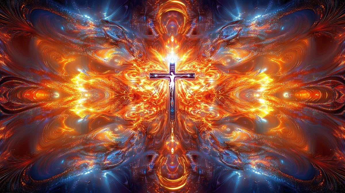 Создано на основе запроса: Stained glass jesus in the cross, all timelines flowing to and from him