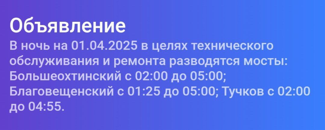 ❗️Сегодня 01.04 разводка 3х мостов: ❌ Благовещенский 1:25 - 5:00 ❌ Тучков 2:00 - 4:55 ❌ Большеохтинский 2:00 - 5:00 👉 Высокий Спрос. Подписаться Ваш таксопарк: «Высокий спрос» 🚕 89697774262 📲 Комиссия от 1% 💰 (Подключаем ко всем фирмам такси и доставки) 🚗📦 #такси #водитель #курьер
