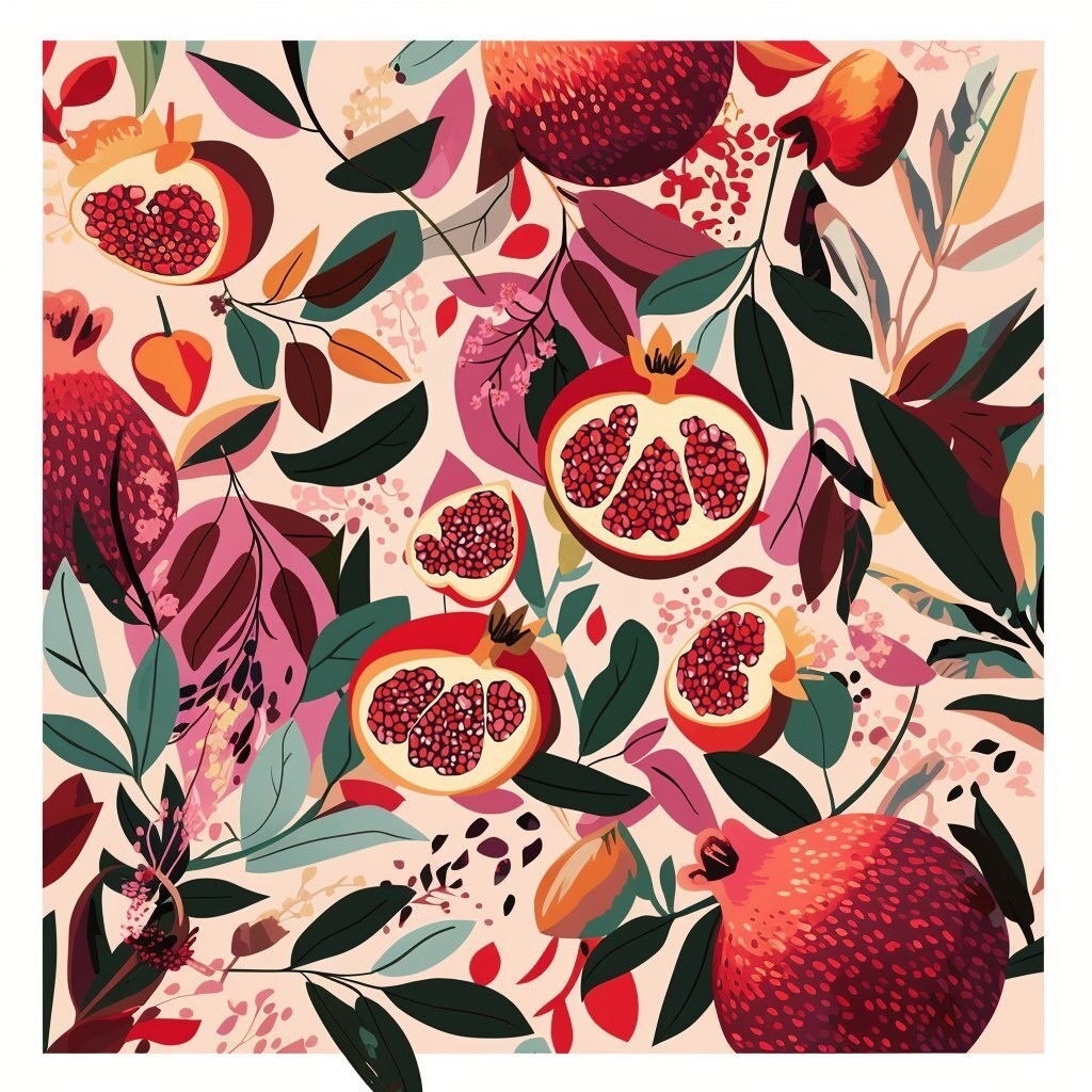 Создано на основе запроса: Flat illustration of whole and halved pomegranates with visible seeds, scattered abstract leaves and floral