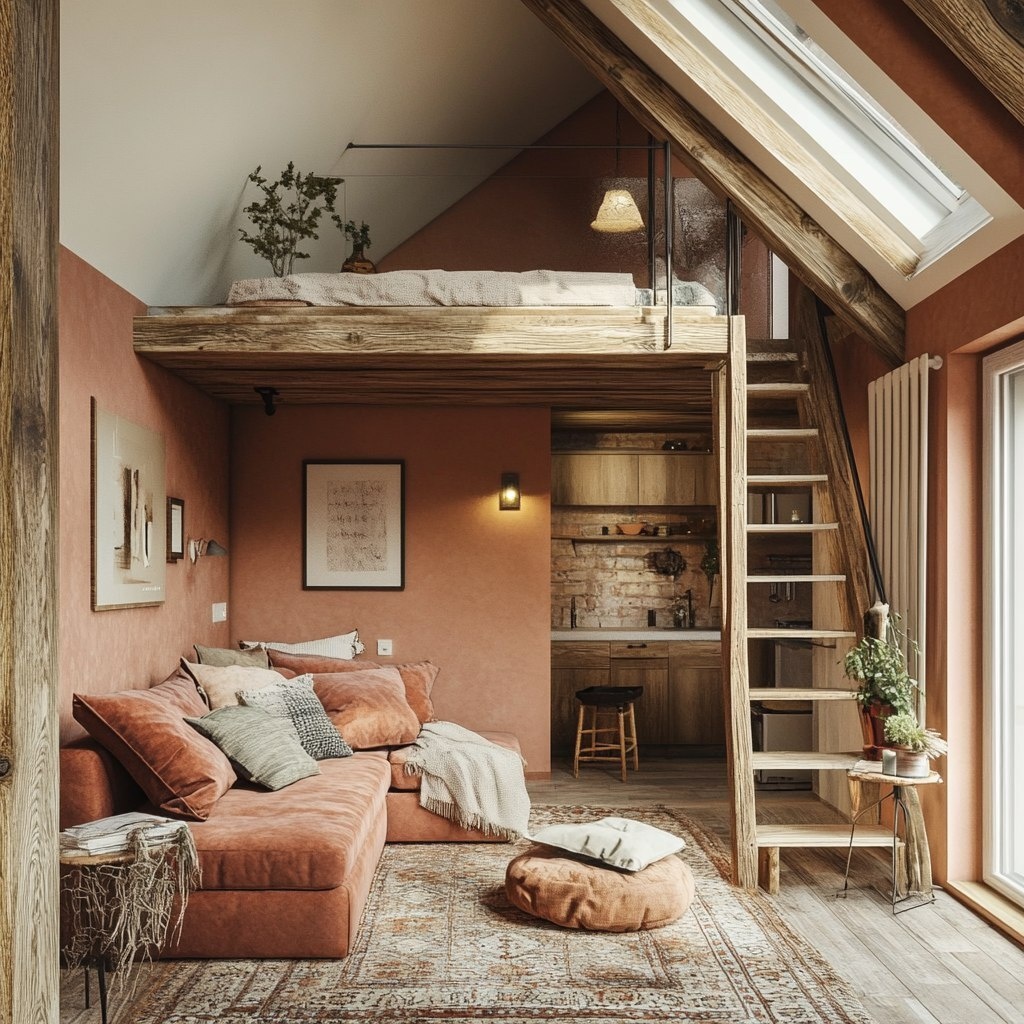 Создано на основе запроса: a cozy loft rooftop apartment with wooden details and terracotta colours on the walls