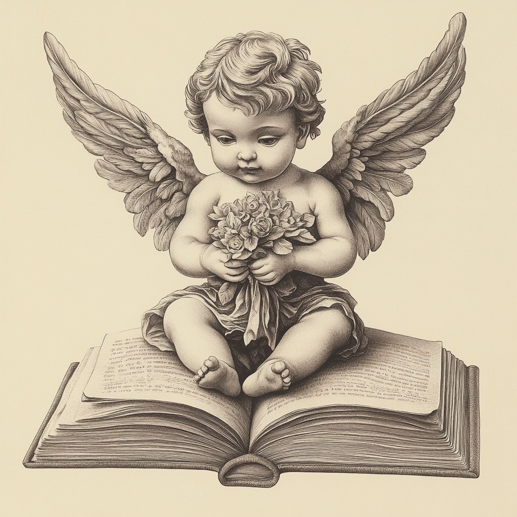 Создано на основе запроса: drawing of a statue of a little boy angel; with wings on his back; a bouquet in his hands and his forearms crossed on an open book --- Автоперевод: рисунок статуи маленького мальчика ангела; Красиво вышло? 🤔 https://dzen.ru/id/65c0c65c86e4f837c27b24d7 #ИИ #AI #нейросеть #midjourney #art