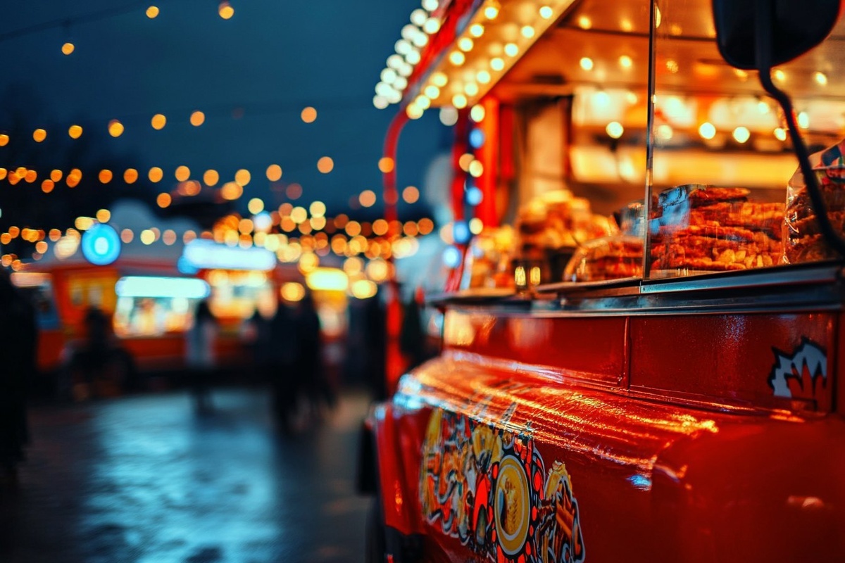 Создано на основе запроса: buying at food trucks at festival close up