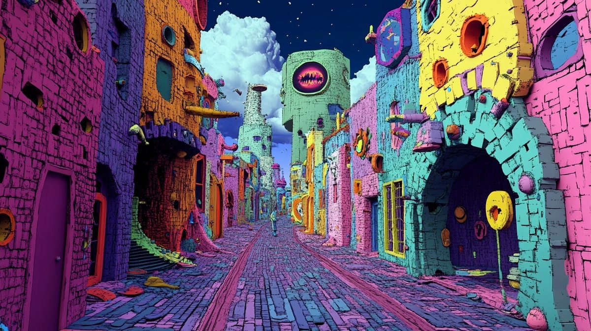 Создано на основе запроса: a cartoon dystopian street made from sticklebricks, psychedelic, colour photograph, dmt