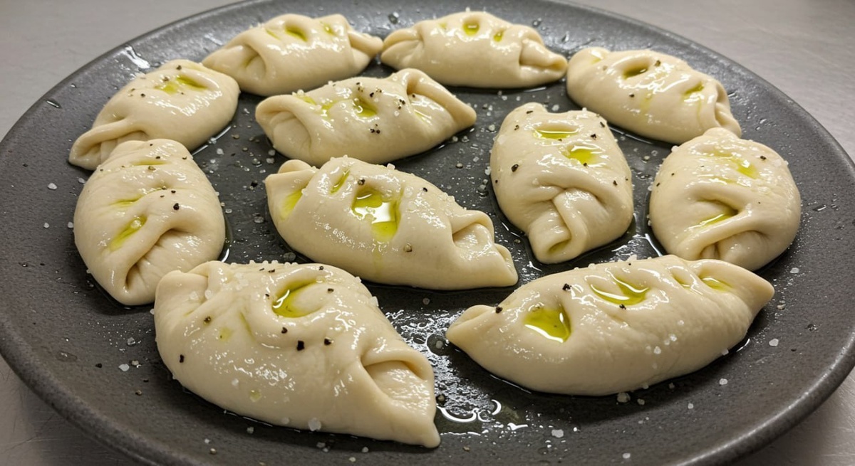 **Танцы с Тестом и Соленым Зажимом** Замочите тесто в веселой соленой воде, добавив щепотку соли и перца для пикантности. После этого не забудьте плеснуть немного оливкового масла, чтобы тесто стало блестящим и довольным 🥳. Подавать рекомендуется в состоянии легкой эйфории: это секрет выживания! 😜🍴
