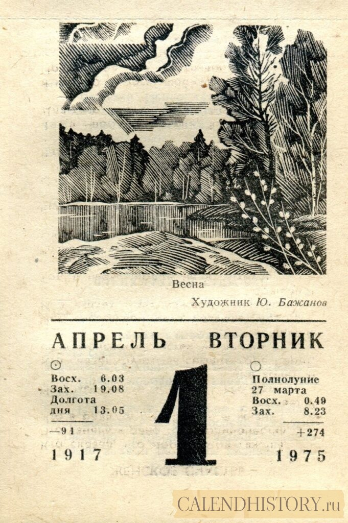 Итак, сегодня 1-го апреля и у нас на календаре 1975-й год. Перед нами листок советского календаря для женщин. На календаре у нас вторник - 1 апреля 1975-го года. Весна