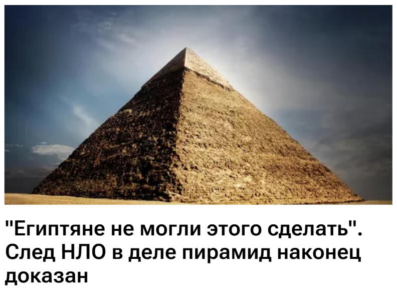 Новости о том, что пирамиды построили НЛО, облетели мир. Теперь люди и ученые могут вздохнуть спокойно: загадка разгадана. Если пирамиды построили пришельцы, то, значит, НЛО существует. Одним махом ученые "убили двух зайцев". Многие годы тратились миллиарды долларов на разгадку тайны строительства пирамид, так как ученые утверждают, что древние люди не могли их построить. И вот, наконец, "вау!", их построили НЛО. Но Библия еще 3000 лет назад рассказала, кто построил пирамиды: "Когда люди начали умножаться на земле и родились у них дочери, 2 тогда сыны Божии увидели дочерей человеческих, что они красивы, и брали их себе в жены, какую кто избрал. 3 И сказал Господь [Бог]: не вечно Духу Моему быть пренебрегаемым человеками [сими], потому что они плоть; пусть будут дни их сто двадцать лет. 4 В то время были на земле исполины, особенно же с того времени, как сыны Божии стали входить к дочерям человеческим, и они стали рождать им: это сильные, издревле славные люди." Бытие 6, Библия Сыны