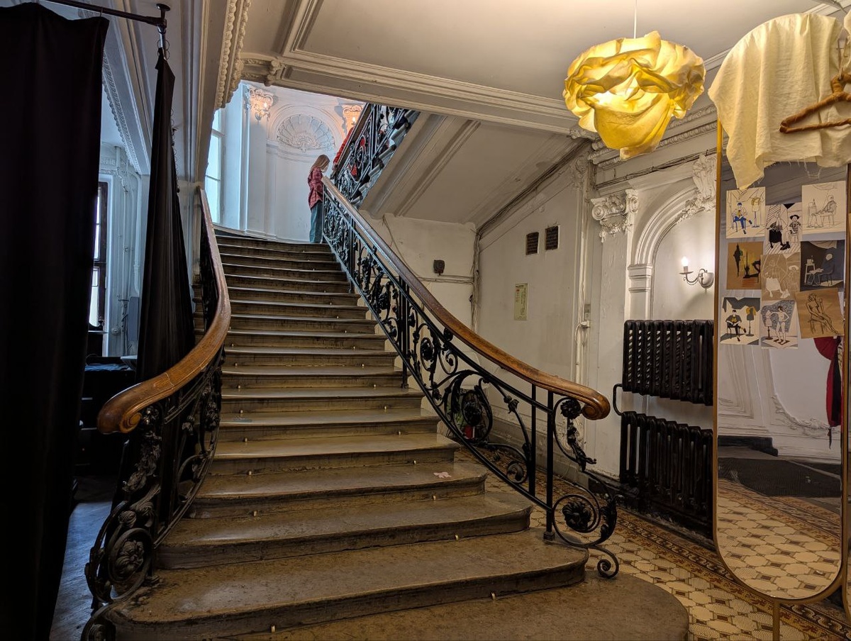 На лестницах ещё остались крюки, при помощи которых крепились ковры к ступеням.