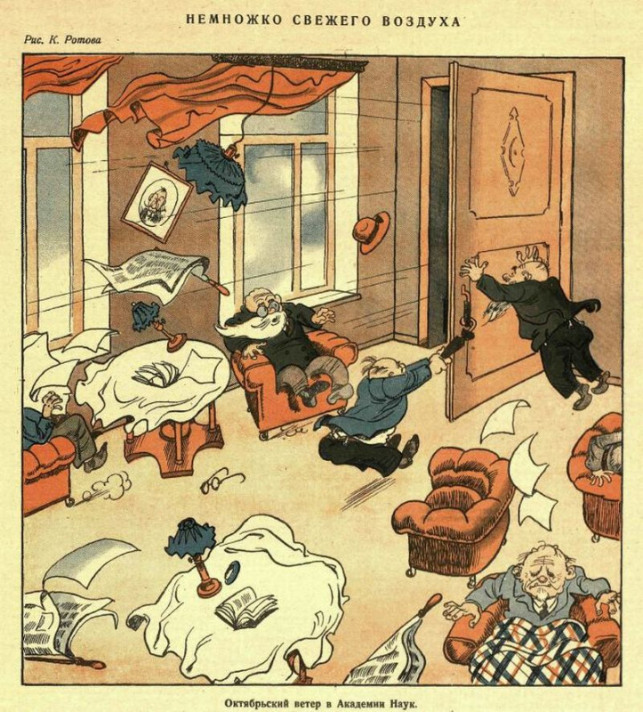 Рисунок Константина Ротова (1902—1959). «Немножко свежего воздуха. Октябрьский ветер в Академии наук». 1928