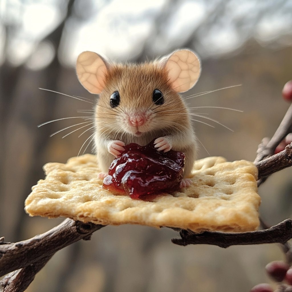 Создано на основе запроса: Muad'dib mouse from Dune on a cracker with jam served as a snack, realistic