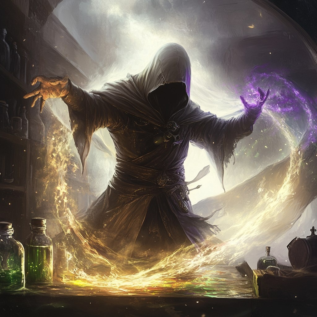 Создано на основе запроса: hooded potion maker in a workshop, glowing purple, green, and yellow in the style of
