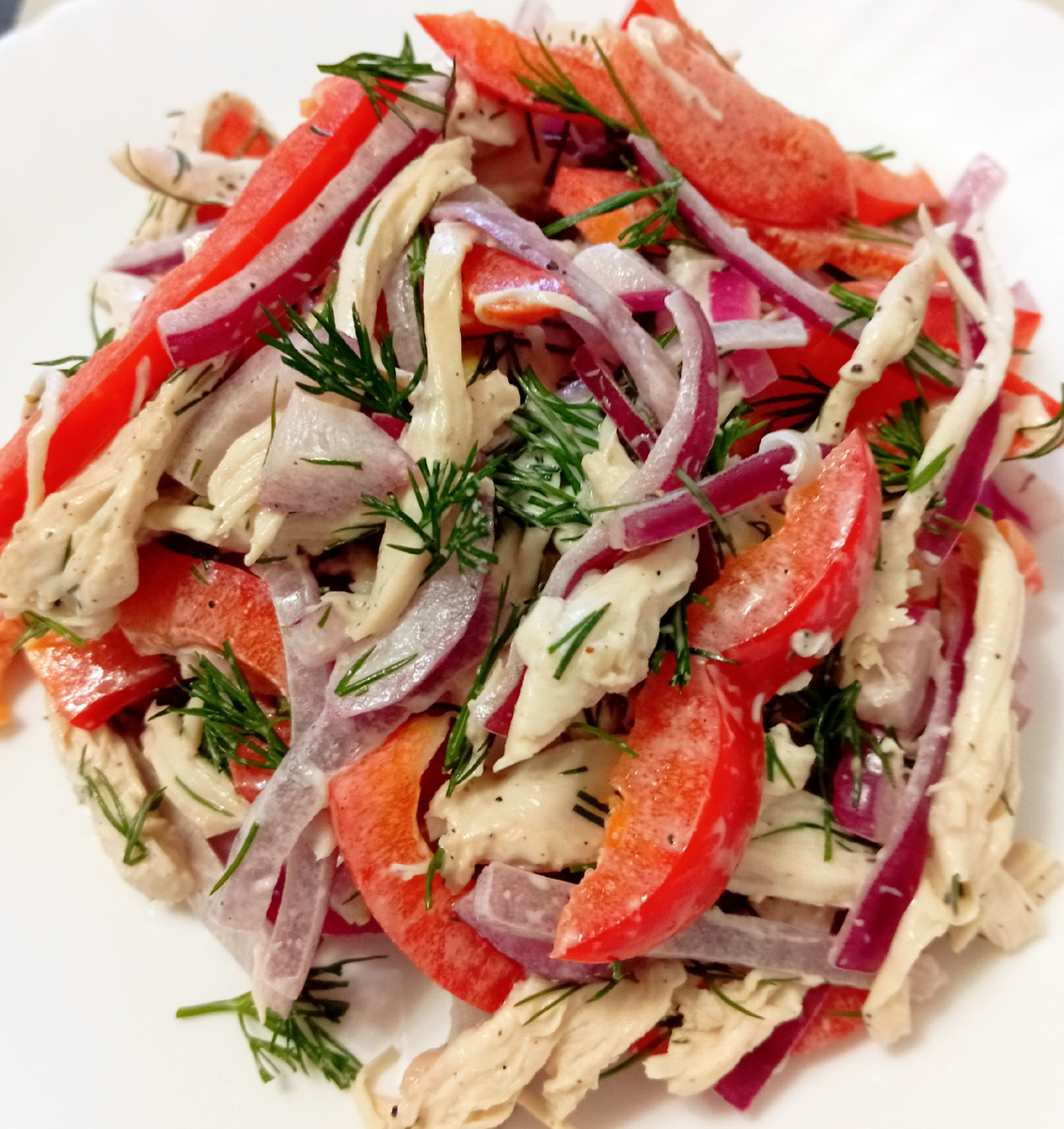 Добрый день, дорогие друзья! Сегодня хочу предложить Вам рецепт простого салата из нескольких ингредиентов. Ингредиенты: - Куриное филе – 500 гр. - Перец сладкий красный – 500 гр. - Лук красный – 2 шт. - Майонез – 4 ст. л. - Укроп – небольшой пучок - Уксус яблочный – 2 ст. л. - Сахар – 1 ч. л. - Соль – 1 ч. л. - Вода – 4 ст. л. Приготовление: 1. Для начала замаринуем лук. Смешаем сахар, соль, яблочный уксус и воду. Нарезаем красный лук полукольцами. Добавляем маринад и тщательно перемешиваем. Оставляем мариноваться на 30 минут при комнатной температуре, периодически перемешивая каждые 5-7 минут. 2. Нарезаем красный сладкий перец соломкой и выкладываем в салатник. 3. Куриное филе отвариваем, остужаем и разбираем его на волокна,добавляем к перцу. 4. Мелко нарезаем укроп. 5. Лук замариновался и стал мягким. Отжимаем его от маринада и выделившегося сока, добавляем к остальным ингредиентам. 6. Заправляем салат майонезом и перемешиваем. При необходимости добавляем соль. Приятного аппетита!!