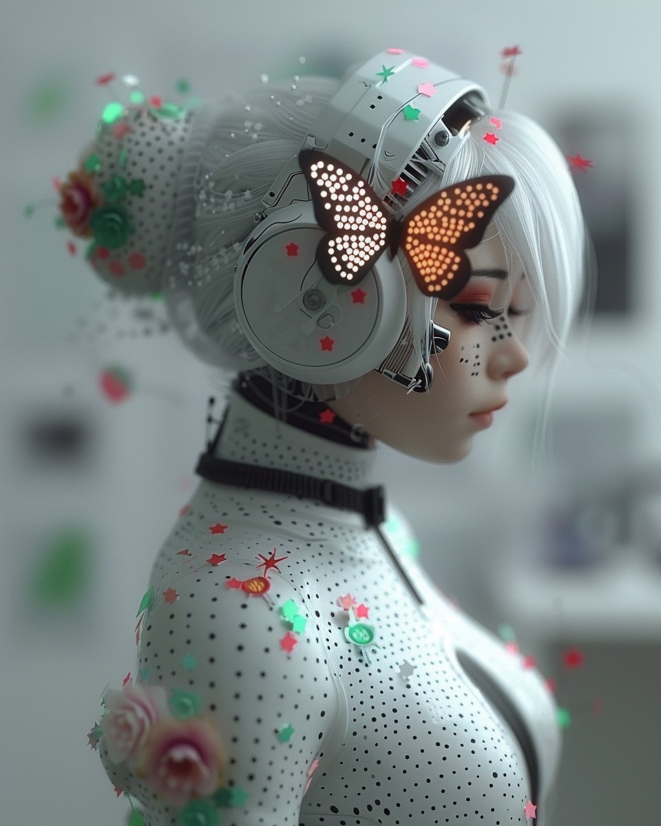 Создано на основе запроса: doll logo , anaglyphic steampunk asian rave gustav klimt, margaret keane, yayoi kusama cute monochromatic purple, formica orange minimalistic robot lepidoptera butterfly, with oled makeup, made of plastic parts, standing in a white high key studio setup. diffused light. medium format camera. full aperture.