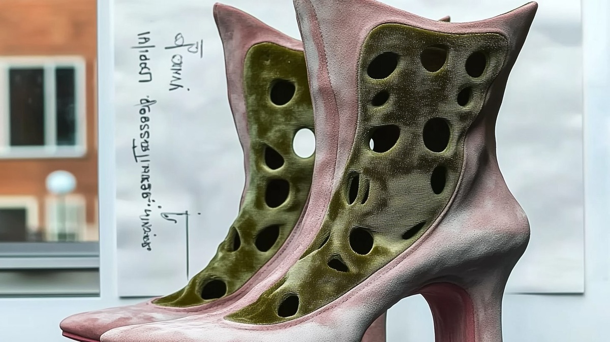 Создано на основе запроса: sculptural tabi heels, matte pink-grey pointed toe, asymmetric upper (moss-green needle-punched velvet + recycled rubber panels), chunky sole with micro-grooves, hidden text "Daily Tasseqm..." etched on sole edge, pure white lab bench backdrop, technical flat sketches with front/side views, avant-garde decaycore aesthetic