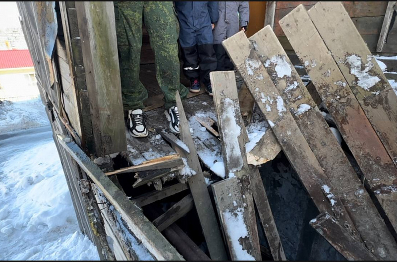 Тяжелый сугроб лавиной сошел с крыши здания на Туристическом проезде, 9, не оставив шансов единственному крыльцу. К счастью, в этот момент на нем не было людей, и никто не пострадал. Однако сейчас совершенно непонятно, как выходить на улицу, и кто будет восстанавливать веранду, сообщает M-MEDIA. О проблеме информационному агентству сообщили жители дома. Они рассказали, что оказались буквально заблокированными в здании. Дети не могут отправиться на занятия, а взрослые — по своим делам. Сразу перед входной дверью у них сейчас большая пропасть из снега и досок. «В нашем доме живет четыре ребенка. Они ходят в садик и школу. Как нам сейчас их отправлять? Через форточку на простынях спускать? Мы не знаем, что теперь со всем этим делать», — рассказала M-MEDIA жительница дома. Снег с крыши дома не убирали после мощного циклона. Он чуть подтаял, напитался водой и по итогу замерз, превратившись в глыбу льда. Накануне большой кусок льда, слетев с крыши и пробив доски веранды, ушел с обломками в п