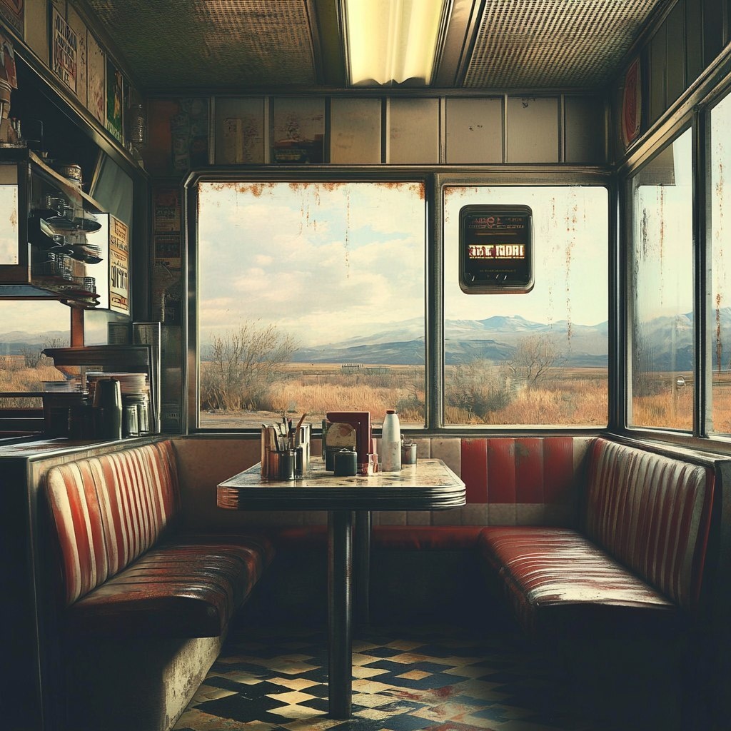 Создано на основе запроса: interior american diner truck stop - 1980's photo realistic - booth - large window - dirty