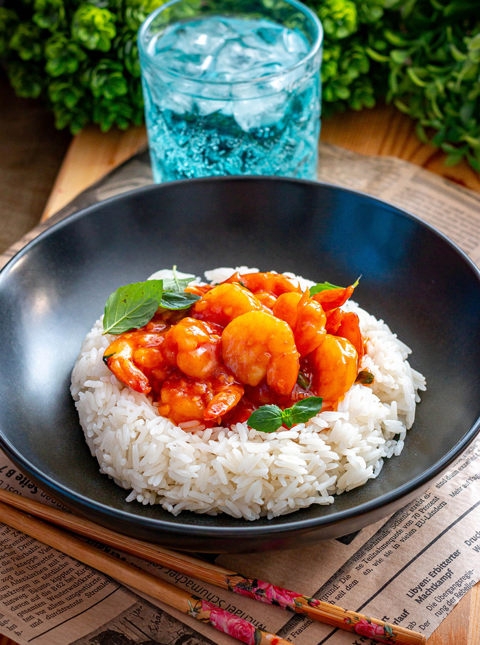 На мой взгляд, это одно из самых вкусных азиатских блюд с креветками. В нем идеально сочетаются сладкий и острый вкусы, а хлопья красного перца придают ему приятную пикантность. Остроту можно регулировать по своему вкусу. В этом блюде вы найдете классические азиатские ароматы: соевый соус, чеснок и имбирь. Процесс приготовления занимает всего около 20 минут, что делает его идеальным для тех, кто ограничен во времени. И никакой фритюрницы! Ингредиенты: 12 Крупных креветок. 4 Ст. л. воды. 2 Ст. л. кетчупа. 1 Ст. л. соевого соуса. 2 Ч. л. кукурузного крахмала. 1, 5 Ч. л. сахара. 0, 5 Ч. л. хлопьев красного перца (или по вкусу) 0, 5 Ч. л. мелко нарезанного имбиря. 2 Ст. л. растительного масла. 2 Ст. л. кунжутного масла. Зеленый лук (но мне нравится с мятой и базиликом, это уже дело вкуса) 4 Зубчика чеснока (мелко порубить) Приготовление: В небольшой миске смешайте воду, кетчуп, соевый соус, кукурузный крахмал, сахар и имбирь. Разогрейте масло в сковороде вок (или обычной глубокой сковороде