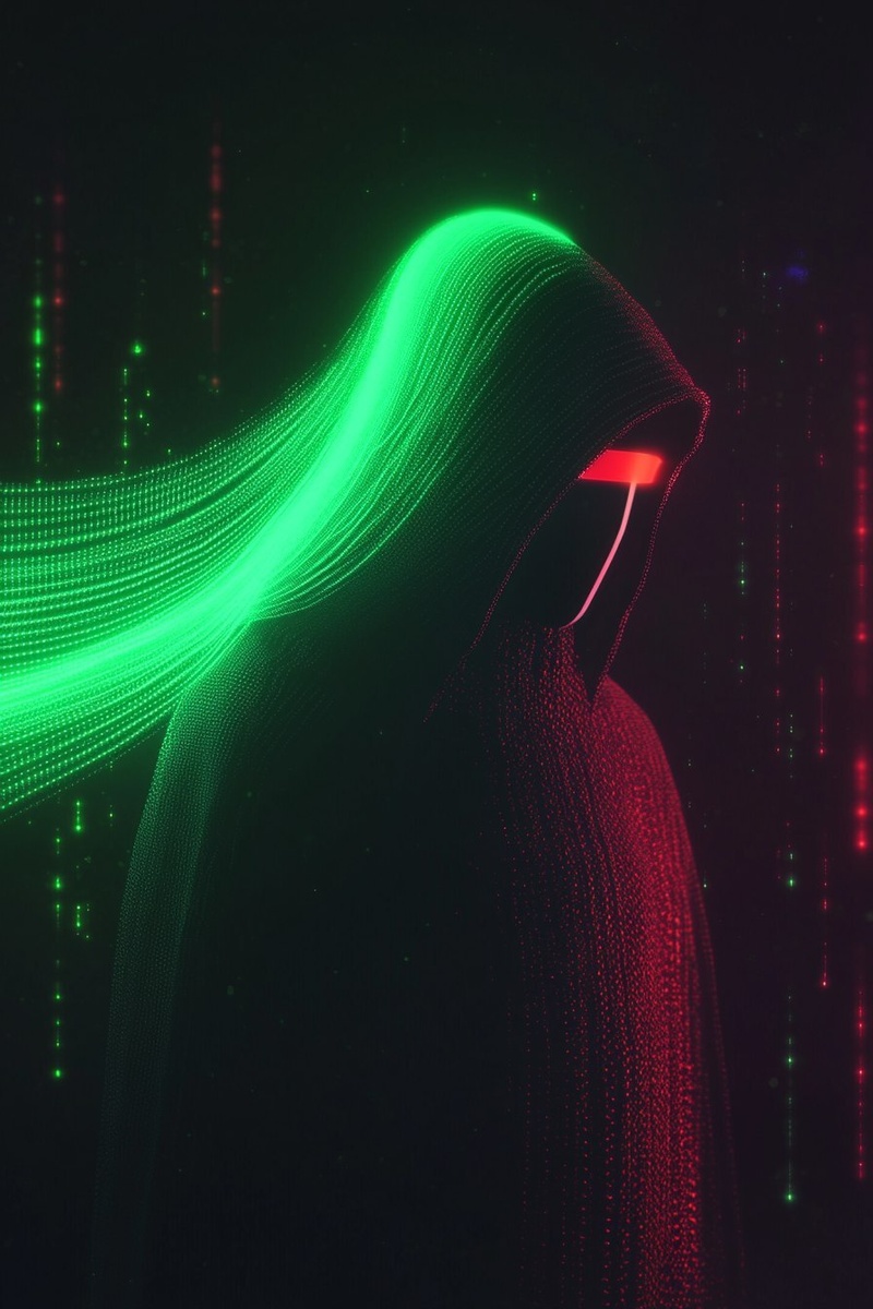 Автоперевод: Современное минимальное искусство с одной линией, фиолетовый фон, загадочный хакер