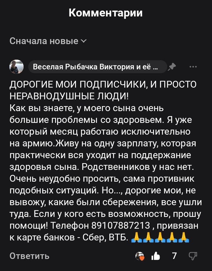 Здравствуйте, мои дорогие друзья, подписчики, и все, кто читает данную статью! Несколько дней назад, я опубликовала ролик, и написала под ним комментарий с просьбой о помощи. Вкратце опишу ситуацию для тех, кто об этом ничего не знает. Мой младший сын служит в Армии с ноября месяца, и практически с этого времени , у него начались очень серьёзные проблемы со здоровьем, которые требуют очень больших материальных затрат. В данный момент все мои ресурсы исчерпаны. Я сама не сторонник вот таких моментов, когда приходиться просить у совершенно незнакомых людей помощи, но ситуация, поверьте из рук вон... И честно говоря, мне очень неудобно и стыдно. По понятным причинам, я не могу выложить сюда полностью подтверждающие документы о состоянии здоровья сына, во избежание ещё больших проблем у него, т. к. данная информация разглашению не подлежит. Сфотографировали данные результаты втихаря. Если вдруг, кто-то сомневается, или захочет узнать более подробно, то я всегда готова к общению.