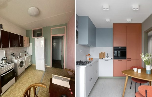 Вход в обновленную кухню перенесли в гостиную, объединив два пространства. Это решение позволило оставить газовую плиту, так как данное помещение не будет использоваться как жилая комната. Новый дизайн включает в себя угловой гарнитур со шкафами-пеналами для встроенной техники.